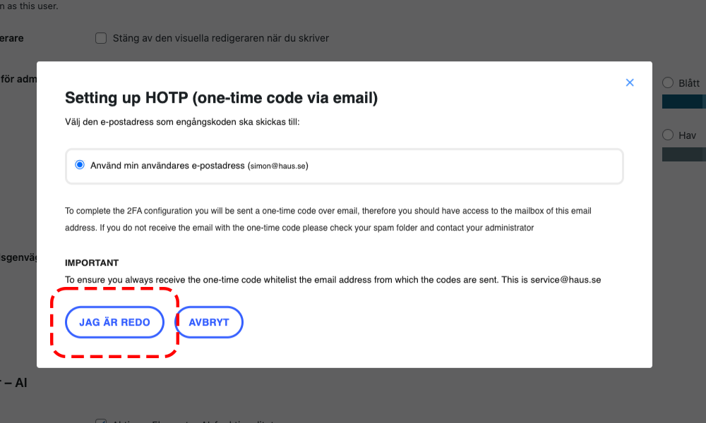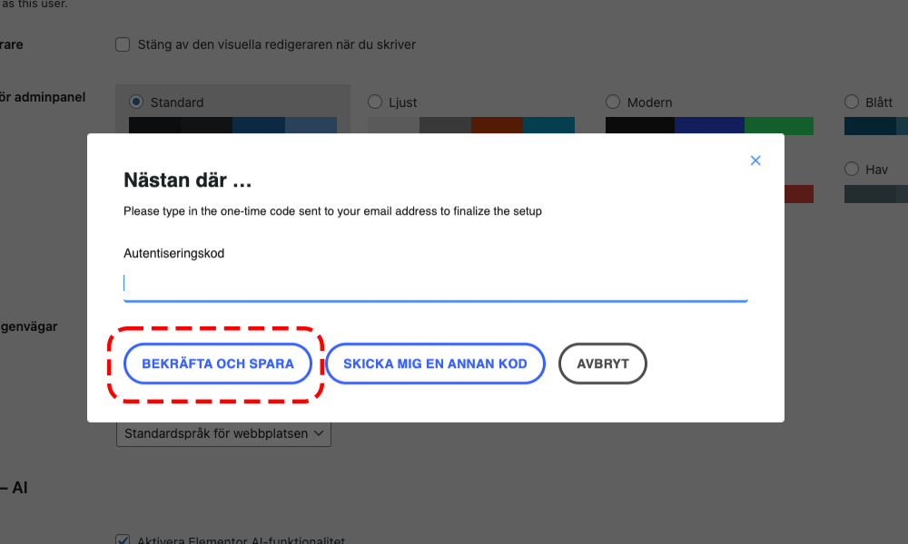 3. Kopiera koden från e-postmeddelandet (avsändare: wp2fa@kopcentrum.se) och ange den på webbplatsen.